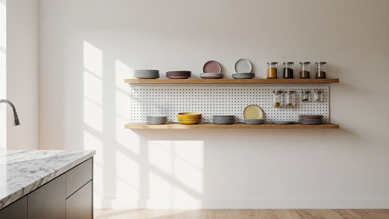 Kitchen. In a bright UK terraced house, a row of 12‑inch oak shelves sits above the countertop, holding everyday plates. The homeowner groups plates by colour, replaces the backs with a white pegboard for spice jars, and wipes down the surface nightly.